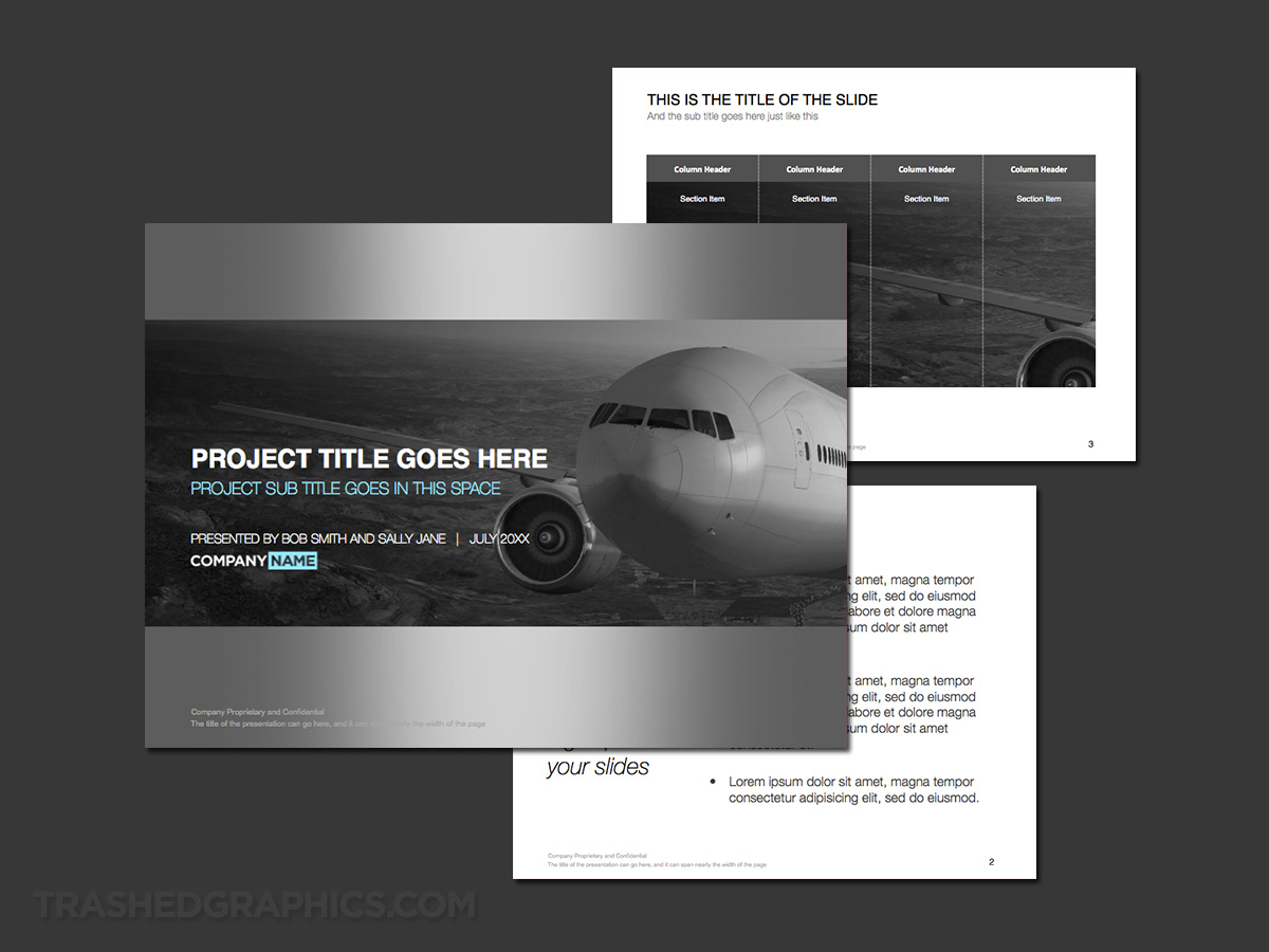 Finally, the metal texture background on every slide is an obvious reference to the aluminum skin of an aircraft, and I thought it fit in with the rest of the design pretty well. Keep in mind that you can edit this template however you like, so feel free to cover that aluminum texture with all white (in the master slides section) if you think it‘s too much.